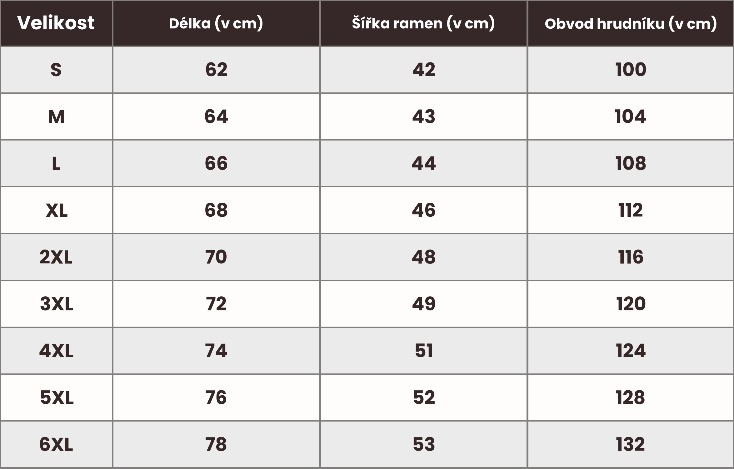 Tabulka velikostí: